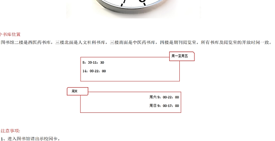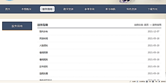 (2)点开蓝色标题栏的“服务指南”可以查看图书馆的布局、开放时间、借阅规则等基本信息,方便我们线下图书馆的使用。