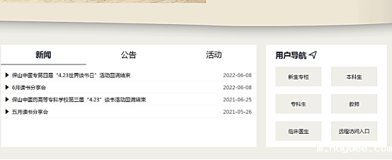 在网页中部,左侧的“新闻”、“公告”、“活动”我们定期都会发布相关的信息,请大家注意关注。右侧的“用户导航”暂未启用。