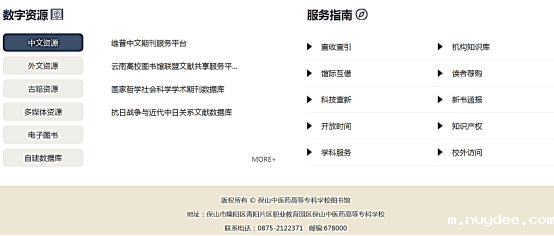 在网页下部,左侧的“数字资源”中目前启用的有“中文资源”、“多媒体资源”和“电子图书”,大家可点击进入进行文献查阅。右侧的“服务指南”目前启用的有“开放时间”和“新书通报”其余我们将陆续启用。