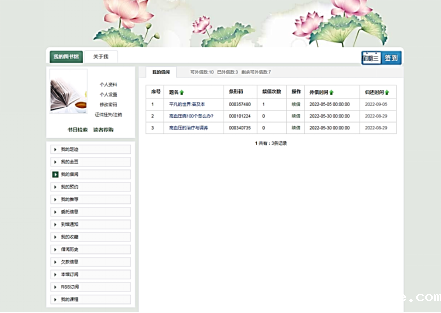 点击左侧对应各栏的文字,就可以查看本人在图书馆的借阅情况,比如点击“我的借阅”便可看到本人最近借阅的书籍,是否超期,如果想续借可点击小字“续借”就可以延迟归还一个月,而无需到图书馆办理。