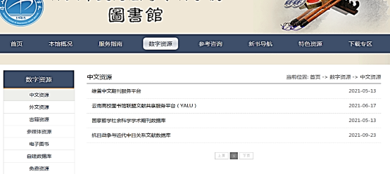 (3)点开蓝色标题栏的“数字资源”可以查看我校图书馆外的文献资料和学术论文,由于权限限制,里边的数据资源只能使用学校的内网查阅和下载。