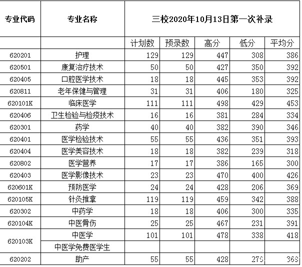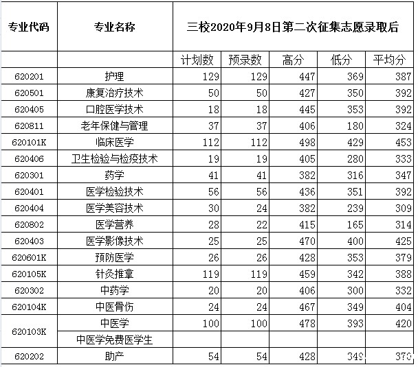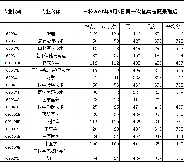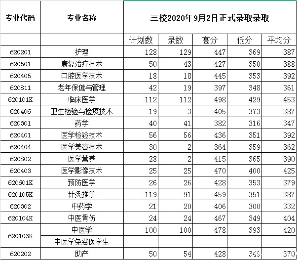 2020年普通专科录取情况统计表